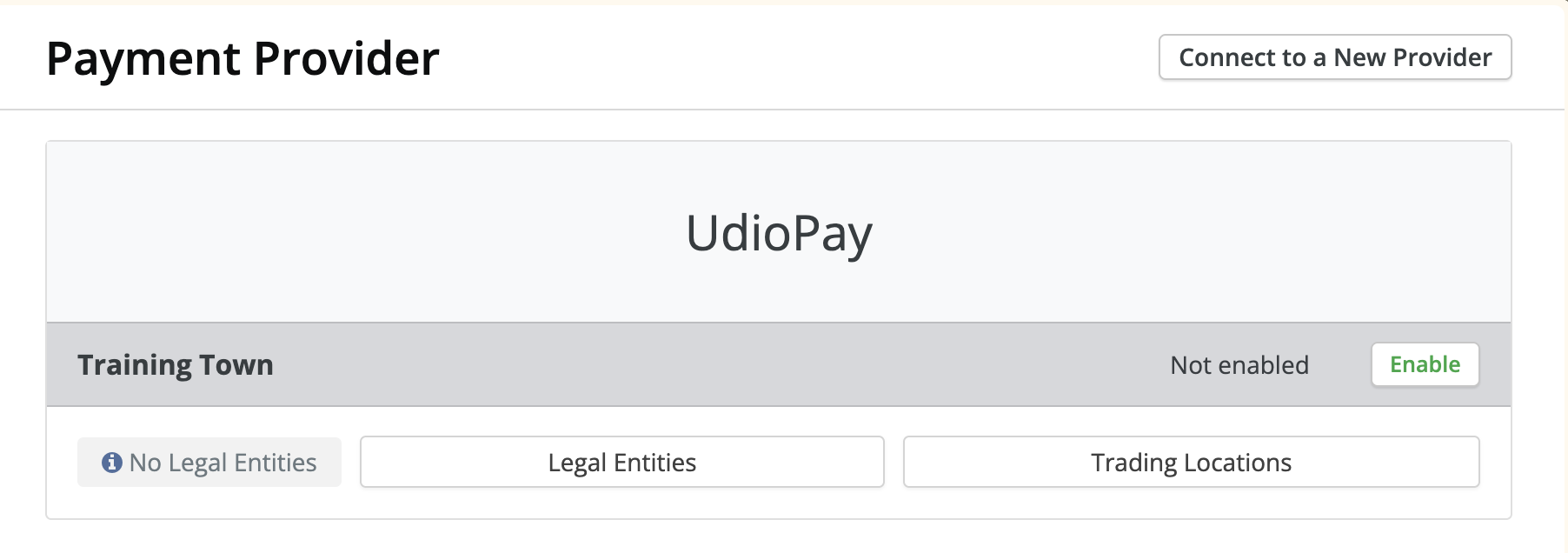 Navigation: Settings → Payment Providers → Udio Pay → Legal Entities