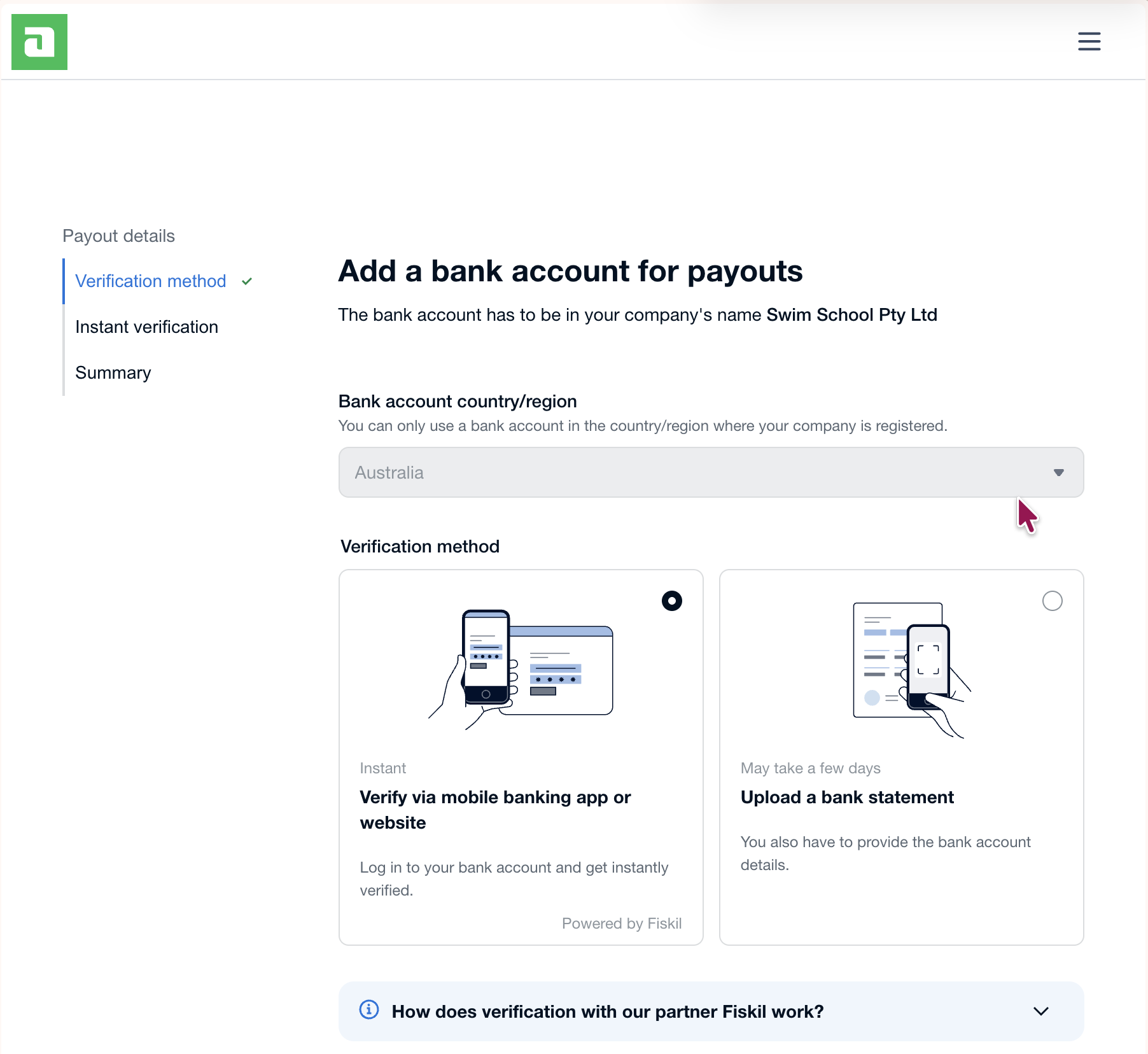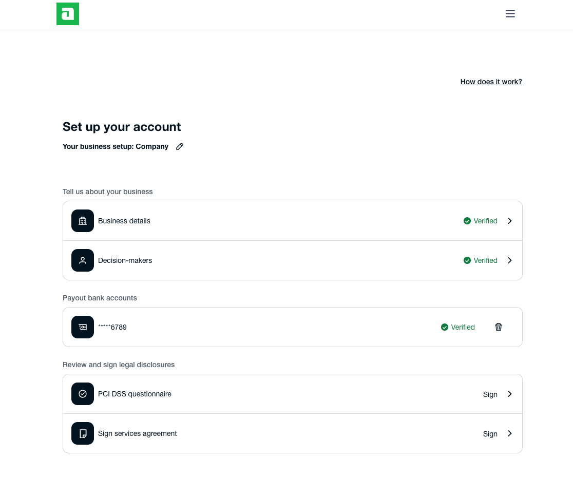 After creating a legal entity, you must complete the onboarding process to verify your identity, business details, and bank account information.